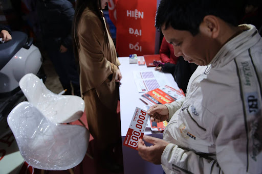 Một khách hàng cầm trên tay voucher SẮM XE GIÁ HỜI, RƯỚC LỘC NĂM MỚI trị giá 500.000Đ